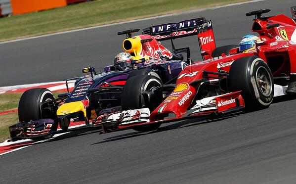 Vettel vinha dos boxes e não tinha os pneus aquecidos. Alonso se aproveitou e passou na pista. Mas Sebastian tinha mais carro. Só faltava concretizar uma ação, uma ultrapassagem. Tocavam pneus, se espremiam, mas a ordem se mantinha. Até que a Red Bull saiu com mais velocidade da Luffield e passou na Copse.